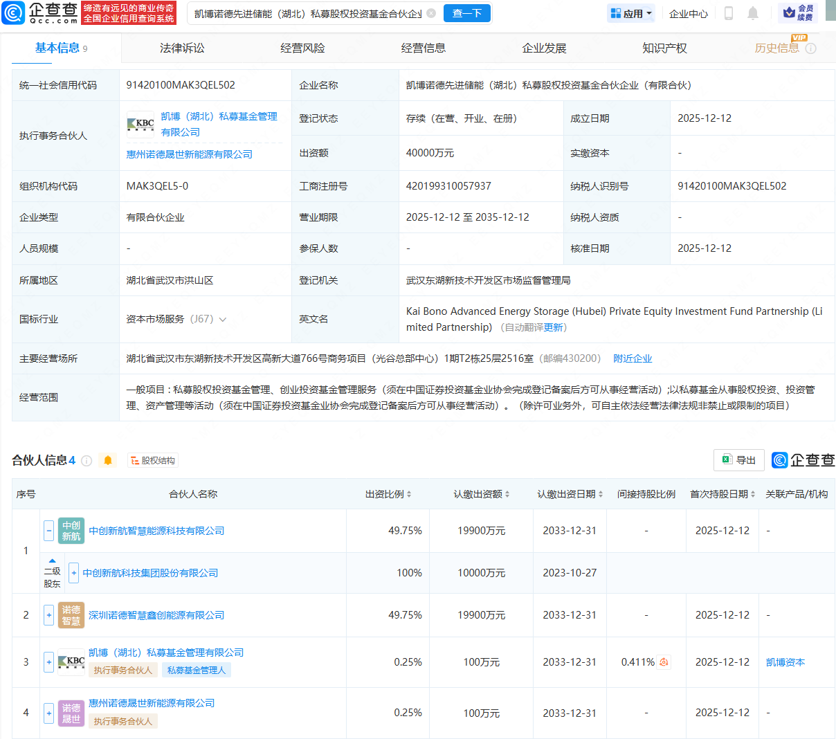 近日,凯博诺德先进储能(湖北)私募股权投资基金合伙企业(有限合伙)成立,出资额4亿元,经营范围包含:私募股权投资基金管理、创业投资基金管理服务;以私募基金从事股权投资、投资管理、资产管理等活动。企查查股权穿透显示鼎红金投,该合伙企业由中创新航(03931.HK)全资子公司中创新航智慧能源科技有限公司、凯博(湖北)私募基金管理有限公司等共同持股。
