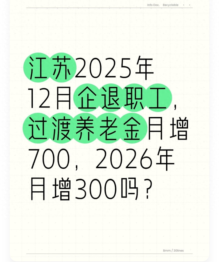 最近江苏不少企业退休职工都在讨论一个话题:2025年12月拿到的养老金里,过渡养老金多了700元,传言2026年每个月还能再增300元,这事儿到底是真的吗?是不是所有企退人员都能享受到?其实这背后是江苏2024年开始实施的过渡性养老金新计发办法,不是普涨福利,而是有明确政策依据的补差调整,今天就用大白话把来龙去脉说清楚。